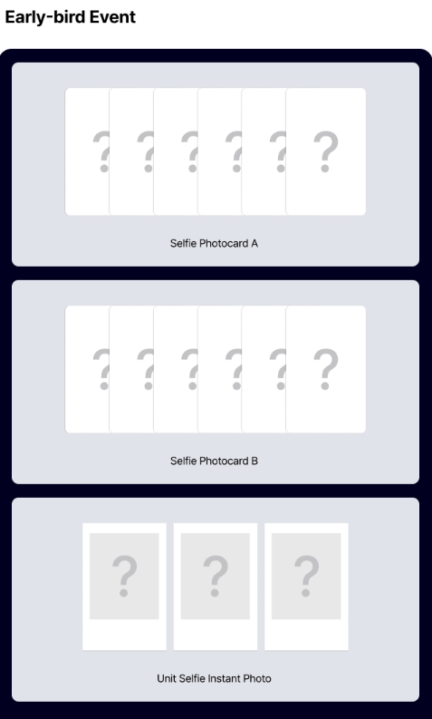 ✅Early Bird POB: get 1 set of unreleased selfie photocards A or B (random 1 out of version A or B) + 1 set of 3 unreleased unit selfie instant photos
