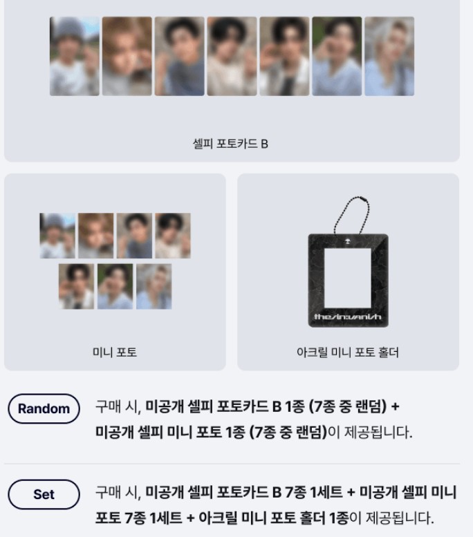 ✅ If you order a set of 7 , you will get 1 set of 7 unreleased selfie photocards B + 1 set of 7 unreleased selfie mini photos + 1 acrylic mini photo holder.