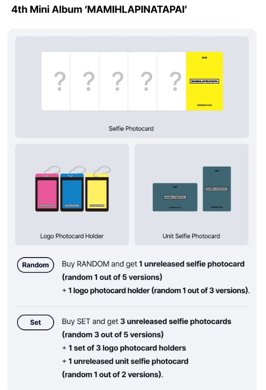 ✅ Purchase 1 random version and get 1 unreleased selfie photocard (random 1 out of 5 versions) + 1 logo photocard holder (random 1 out of 3 versions).